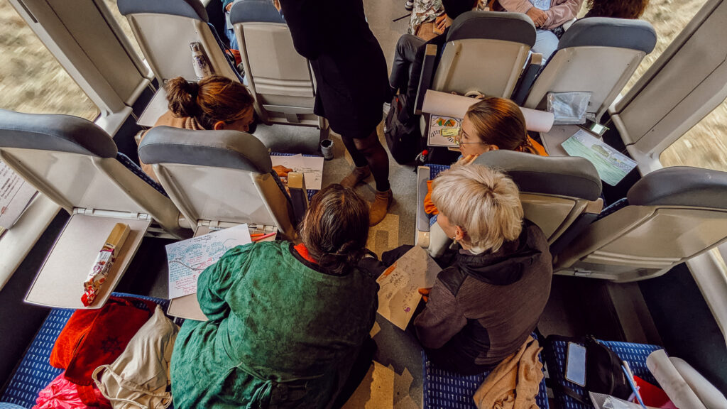 La rencontre a commencé avant même d’arriver à Saint-Claude. Les participant.e.s ont emprunté le TER depuis Dole, où une lecture du paysage leur était proposée. Cette initiative a permis de promouvoir la mobilité douce et écologique, d’envisager les temps de transport autrement, de créer une opportunité de rencontres pour renforcer les liens entre participant.e.s., de prendre le temps d’observer la diversité géographique du Jura (plaines, montagnes, forêts et vallées) et les enjeux climatiques associés et enfin de prendre conscience des enjeux liés à l’accès aux mobilités du fait du risque de fermeture de la ligne des Hirondelles.